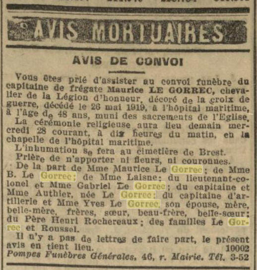 - Décédé le 26 mai 1919 à BREST (Finistère)