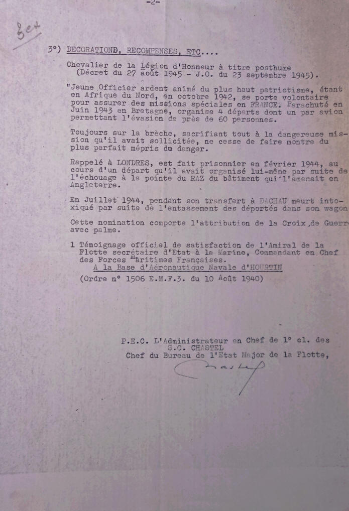 le 10 août 1943, il fut fait chevalier de la légion d'honneur à