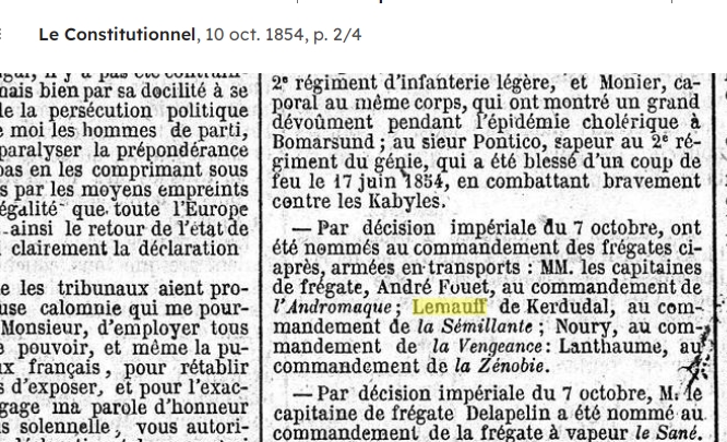 Commandant de la Sémillante, désigné le 7 octobre 1854, avec le