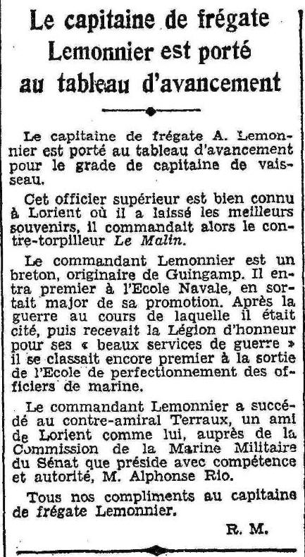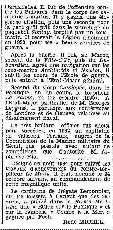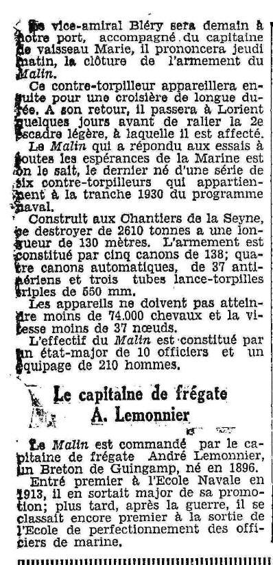 contre-torpilleur Le Malin, du 15 décembre 1934 à août 1936.