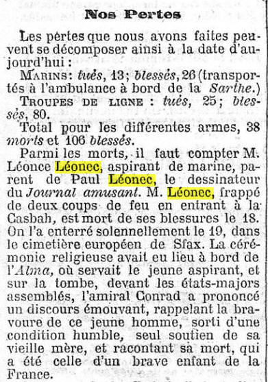 BREST (Finistère) - Tué le 18 juillet 1881 à SFAX (Tunisie)