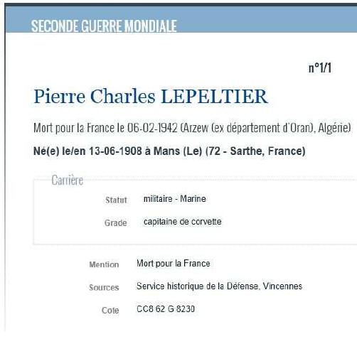 Décédé le 6 février 1942 en baie d'AZREW, ALGÉRIE.