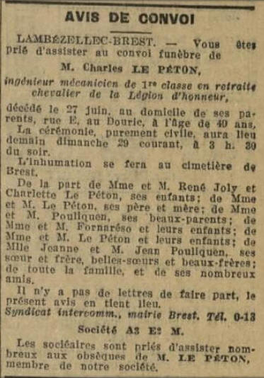 Né le 31 mai 1881 à BREST (Finistère) - Décédé le 27 juin 1930 à