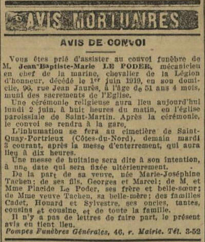 Né le 11 janvier 1868 à SAINT-QUAY-PORTRIEUX (Côtes d'Armor) -