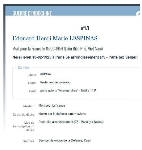 (Seine) - Décédé le 15 mars 1954 au nord de DIEN BIEN PHU (Nord