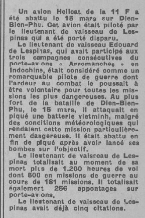 bataille de Diên Biên Phu, abattu par la DCA au cours de son piqué