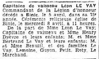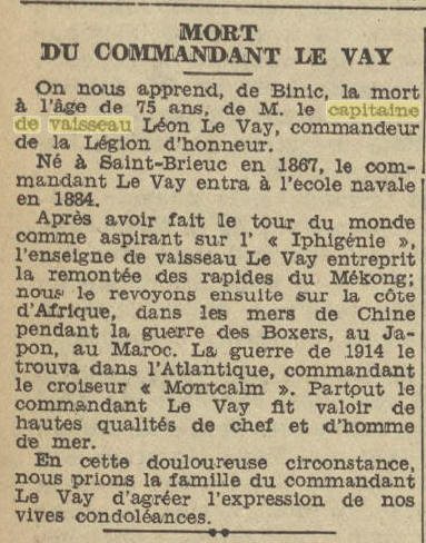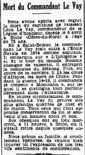 (Côtes-d'Armor) - Décédé le 5 avril 1942 à BINIC (Côtes-d'Armor).