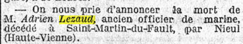 Lacourcelle à SAINT PRIEST (Cher) - Décédé le 18 décembre 1920 à
