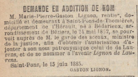 Bernard Alphonse LIGNON et de Marie Mathilde FERROUIL de LAURENS