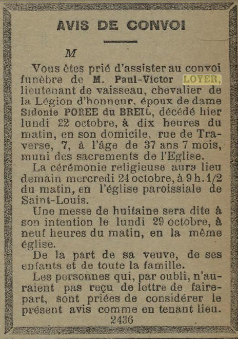 Né le 14 mars 1857 à BREST (Finistère) - Décédé le 22 octobre 1894 à BREST