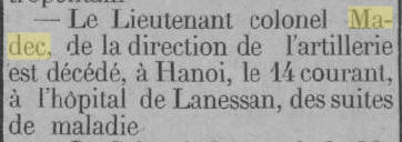 BREST-RECOUVRANCE (Finistère) - Décédé le 14 janvier 1930 à HANOÏ,
