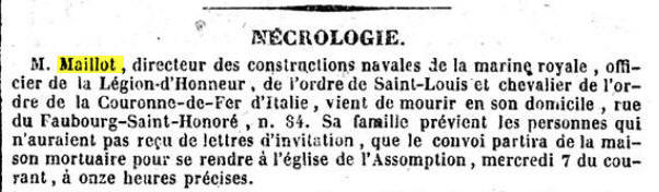 Fin de sa carrière le 6 novembre 1837 suite à son décès