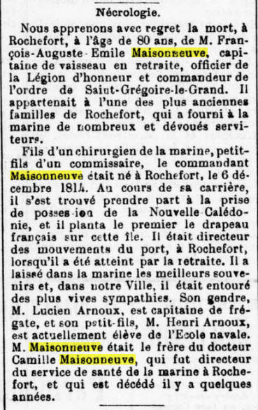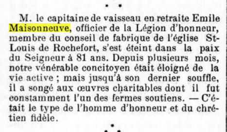 ROCHEFORT (Charente maritime) - Décédé le 20 septembre 1895 à