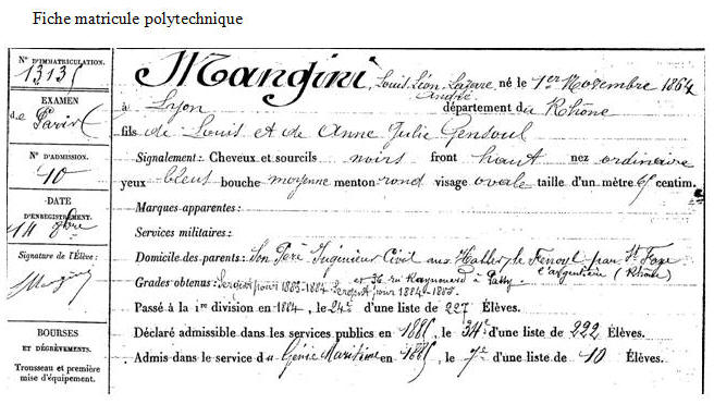 1er Novembre 1883 : il entre à l’Ecole Polytechnique.