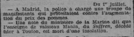 "SUFFREN", y décède d'une insolation le 30 juin 1914