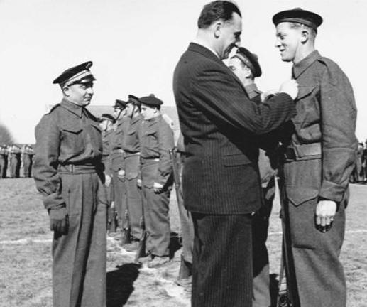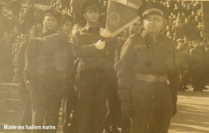 Louis Jacquinot décore un fusilier marin du 4e R.F.M.
