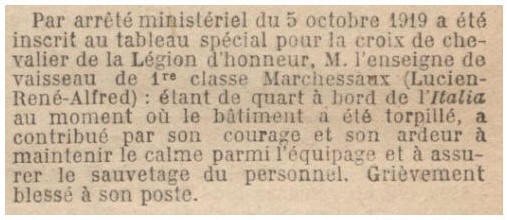 est cité à l'ordre de l'Armée navale : "De quart au moment où le