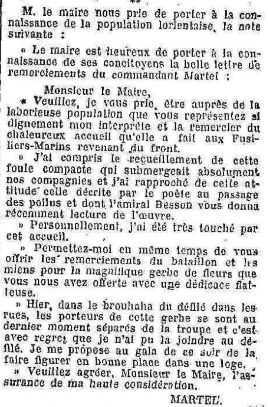 Extrait Le Nouvelliste du Morbihan / 15 février 1919