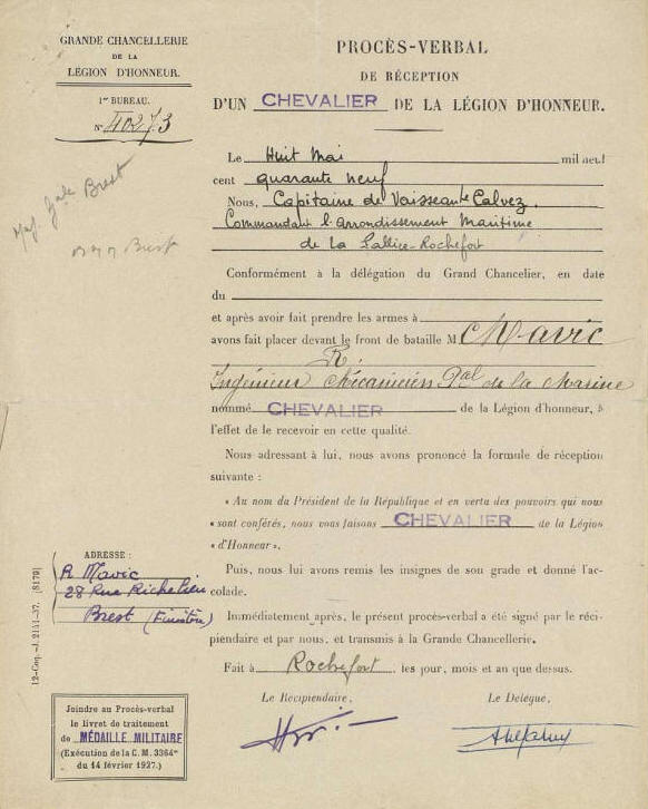 Chevalier de la Légion d'Honneur le 29 décembre 1948