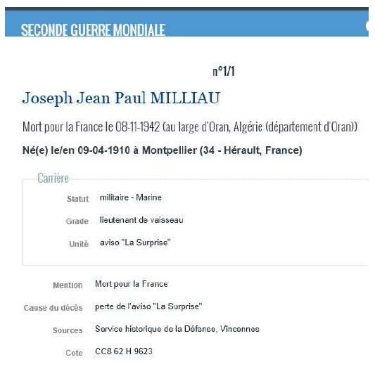 27 novembre 1942, le lieutenant de vaisseau Milliau a reçu la