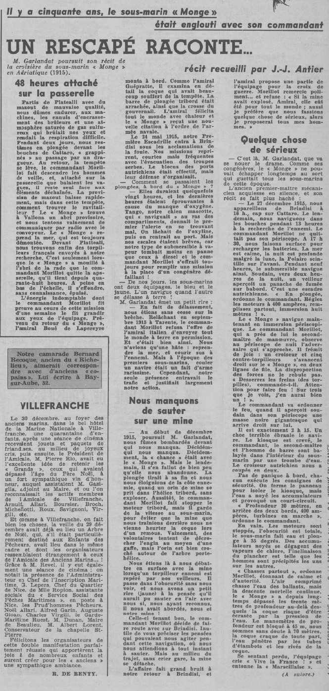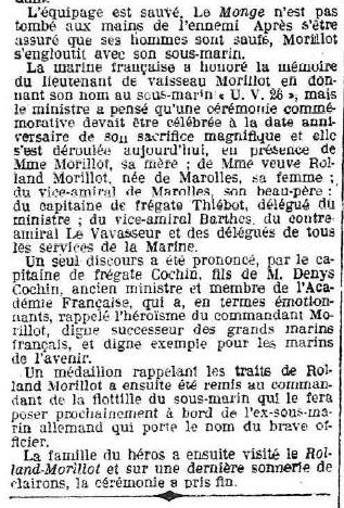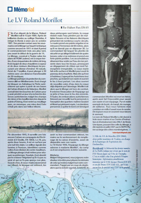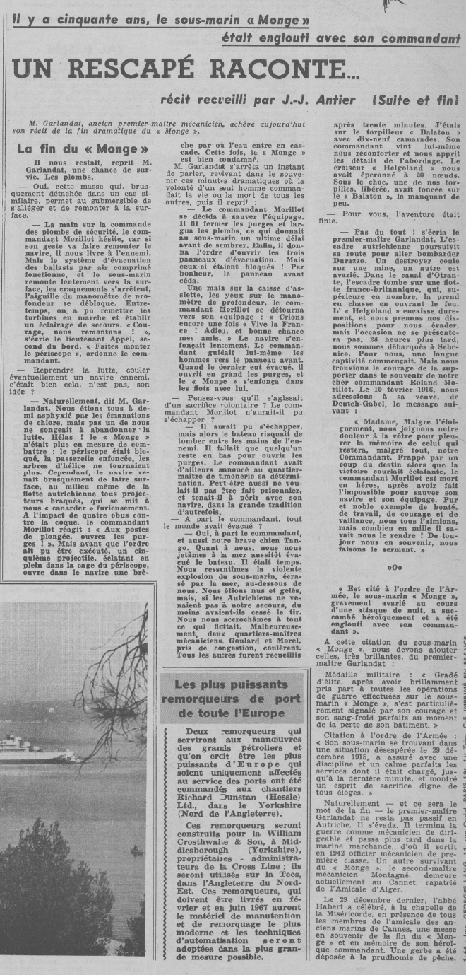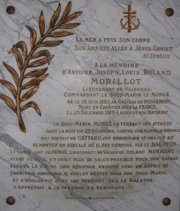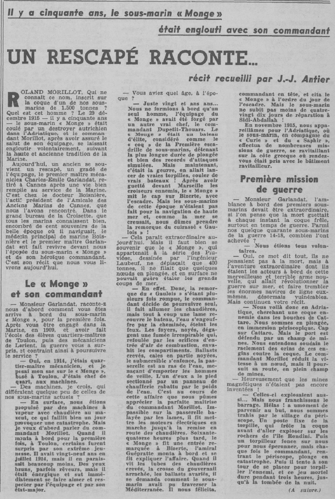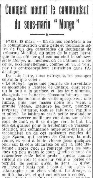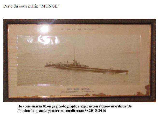 le novembre 1913, il commande le sous-marin "MONGE" en mai 1914.