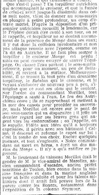 Le 28 décembre 1915, le "MONGE" en patrouille devant CATTARO est abordé par le croiseur autrichien "HELIGOLAND".