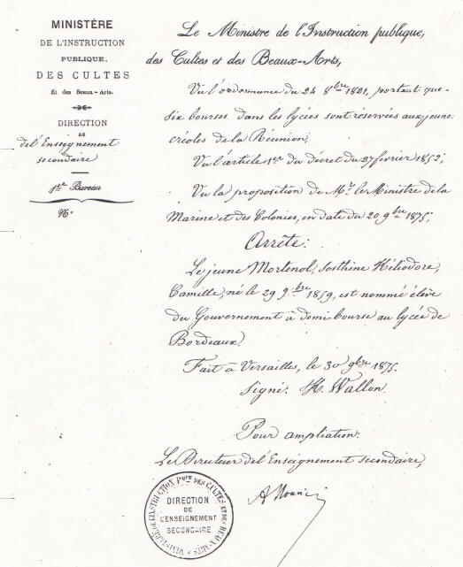 demande de bourse du jeune Mortenol pour le lycée de Bordeaux afin
