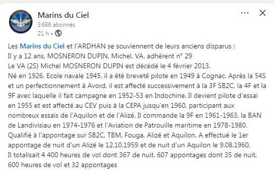 Qualifié à l'appontage sur SB2C, TBM, Fouga, Alizé et Aquilon, le