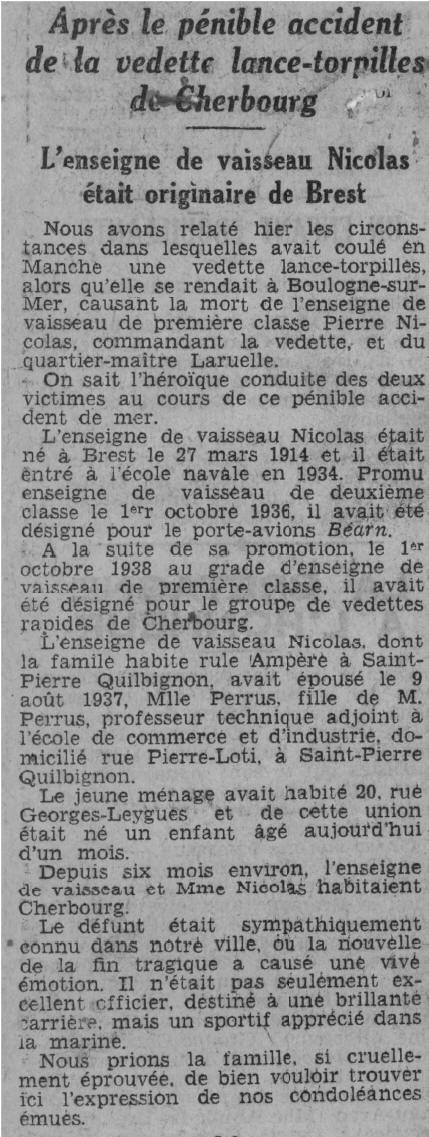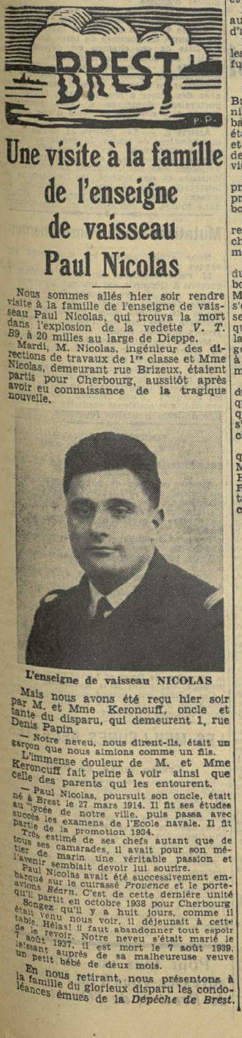du 9 novembre 1939, l'enseigne de vaisseau Nicolas a été nommé