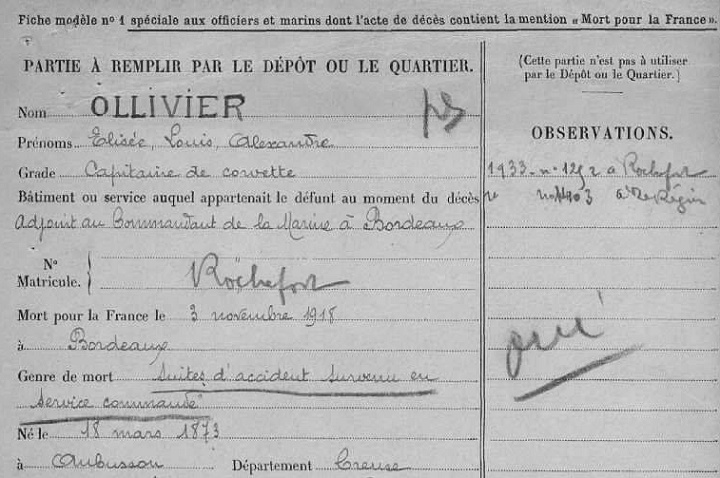 AUBUSSON (Creuse) - Décédé le 3 novembre 1918 à BORDEAUX (Gironde).