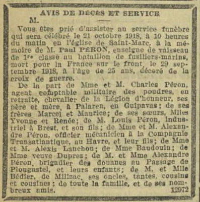 Bataillon de Fusiliers Marins, est tué aux combats, au passage de