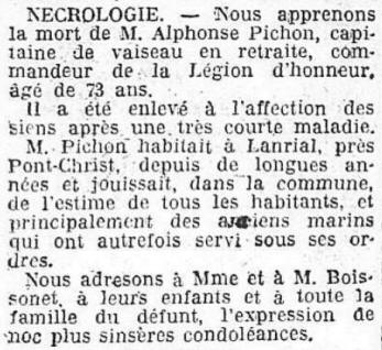 BREST (Finistère) - Décédé le 6 avril 1926 à PLOUESCAT (Finistère)