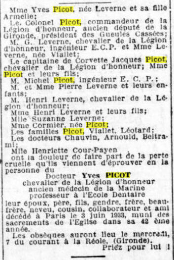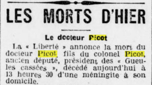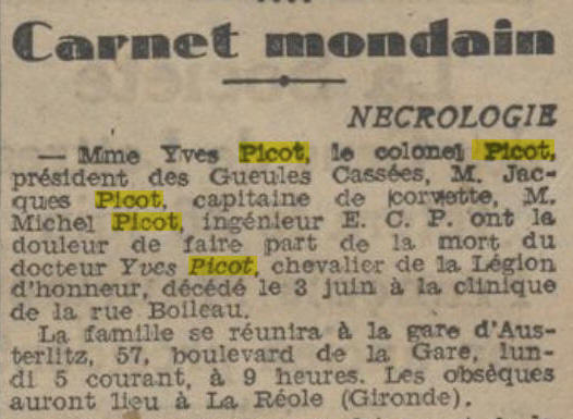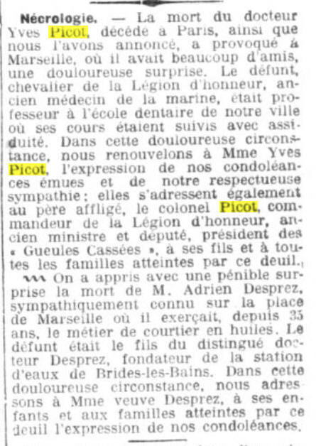 Fils du Colonel Yves Emile Picot (Né le 18 mars 1862 - Décédé en 1938),