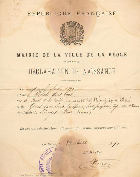 Né le 29 aout 1891 à LA REOLE (Gironde) - Décédé le 3 juin 1933 à