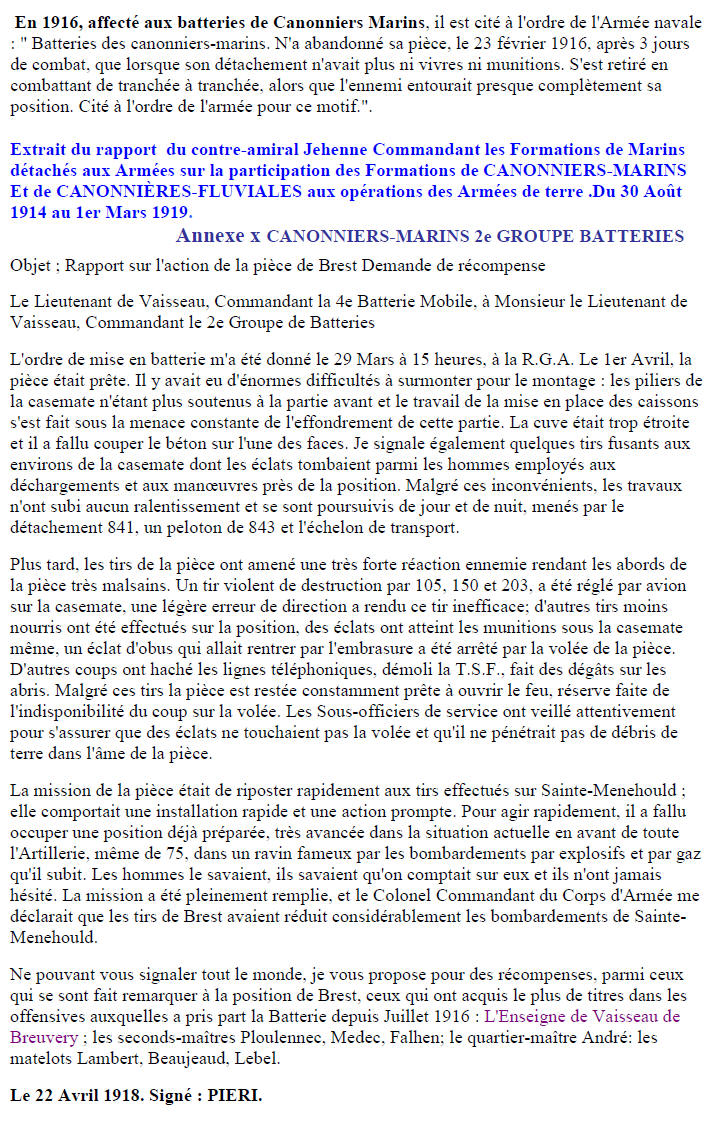 batteries de Canonniers Marins, il est cité à l'ordre de l'Armée