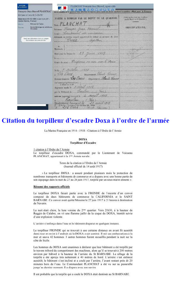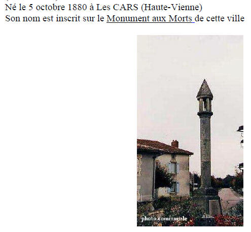Les CARS (Haute-Vienne) - Décédé le 26 juin 1917 en mer, dans le