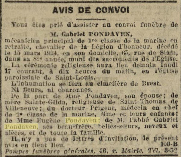 BRÉLÈS (Finistère) - Décédé le 15 mars 1924 à BREST (Finistère)