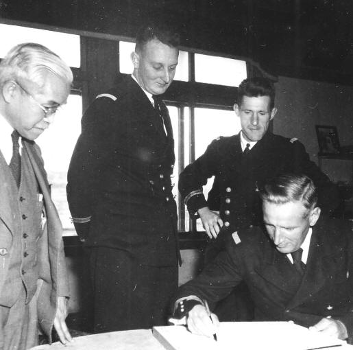 1951.De gauche à droite, debout, le directeur du chantier naval,
