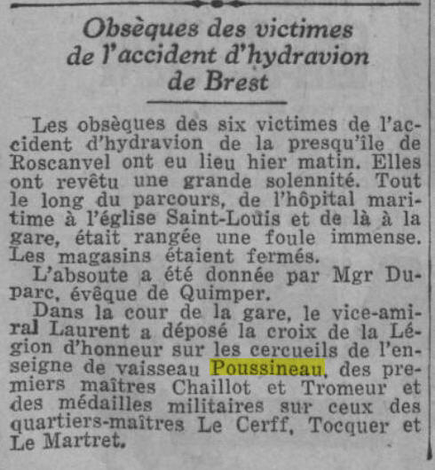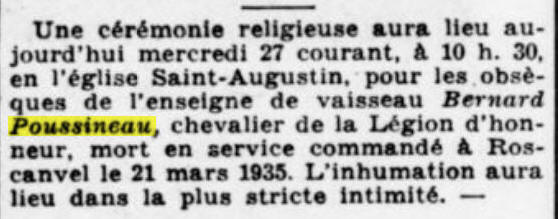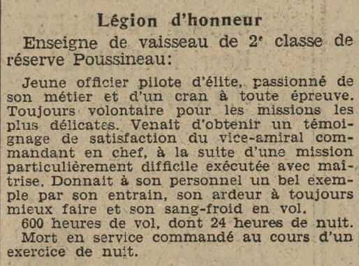 1935, l'enseigne de vaisseau Poussineau a reçu la citation suivante