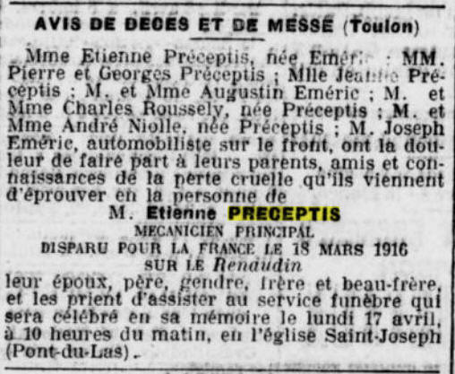 En 1916, affecté sur le contre-torpilleur "RENAUDIN", il disparaît