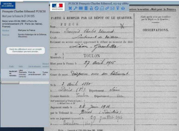décès rendu le 28 juin 1916 à BREST, transcrit à TOULON le 27