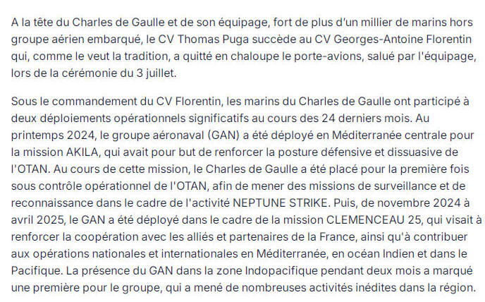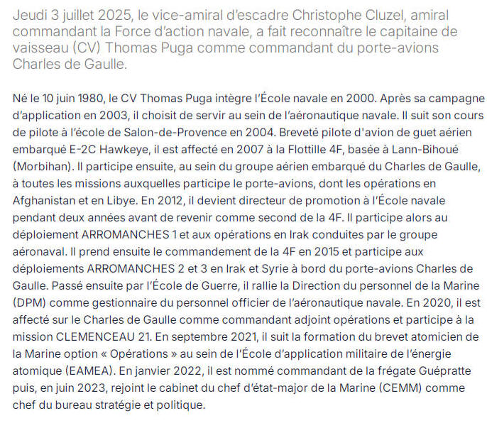 Le 3 juillet 2025, prend le commandement du PA Charles De