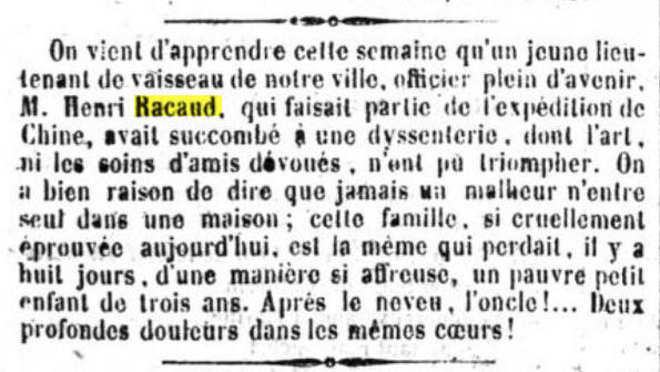 LA ROCHELLE (Charente Maritime) - Décédé le 4 octobre 1860 en mer