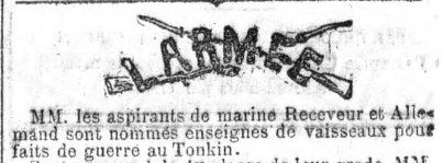 30 avril 1884; port CHERBOURG, suite à faits de guerre au TONKIN