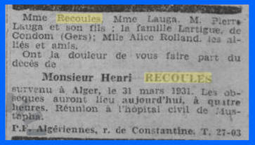 BORDEAUX (Gironde) - Décédé le 31 mars 1931 à ALGER (Algérie)
