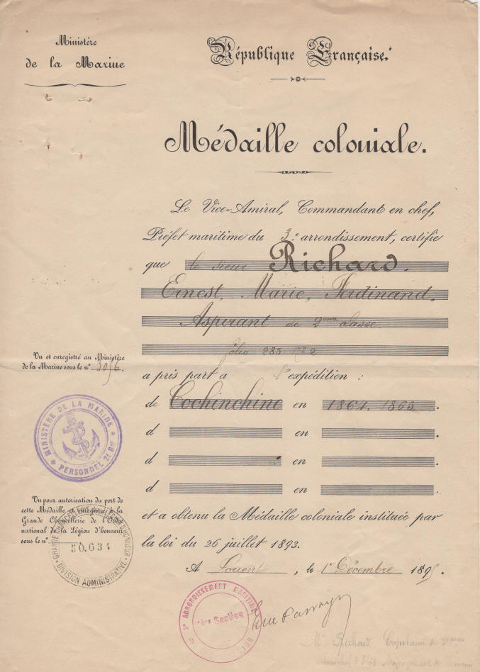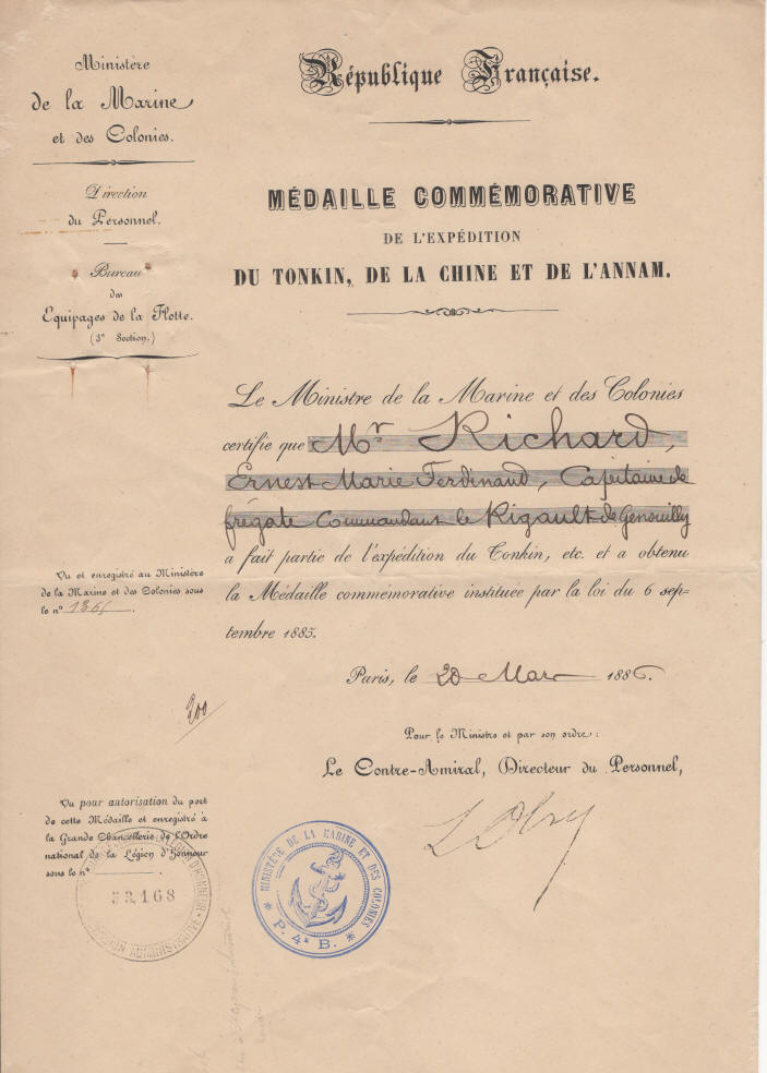 d'Honneur le 19 décembre 1886, étant sur le "COLBERT".