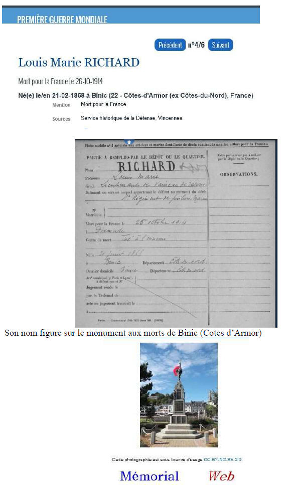 Né le 21 février 1868 à BINIC (Côtes d'Armor) - Décédé le 26 octobre