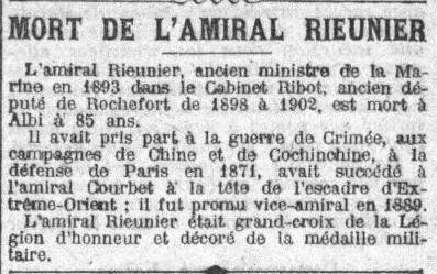 l’Amiral Henri Rieunier (1833-1918), Obsèques Grandioses, célébrées