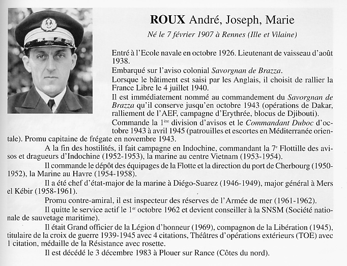 Promu capitaine de frégate en avril 1943, André Roux est placé, en
