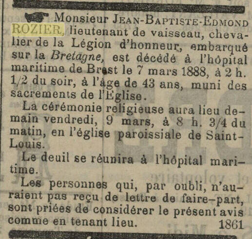 BREST (Finistère) - Décédé le 7 mars 1888 à BREST (Finistère)